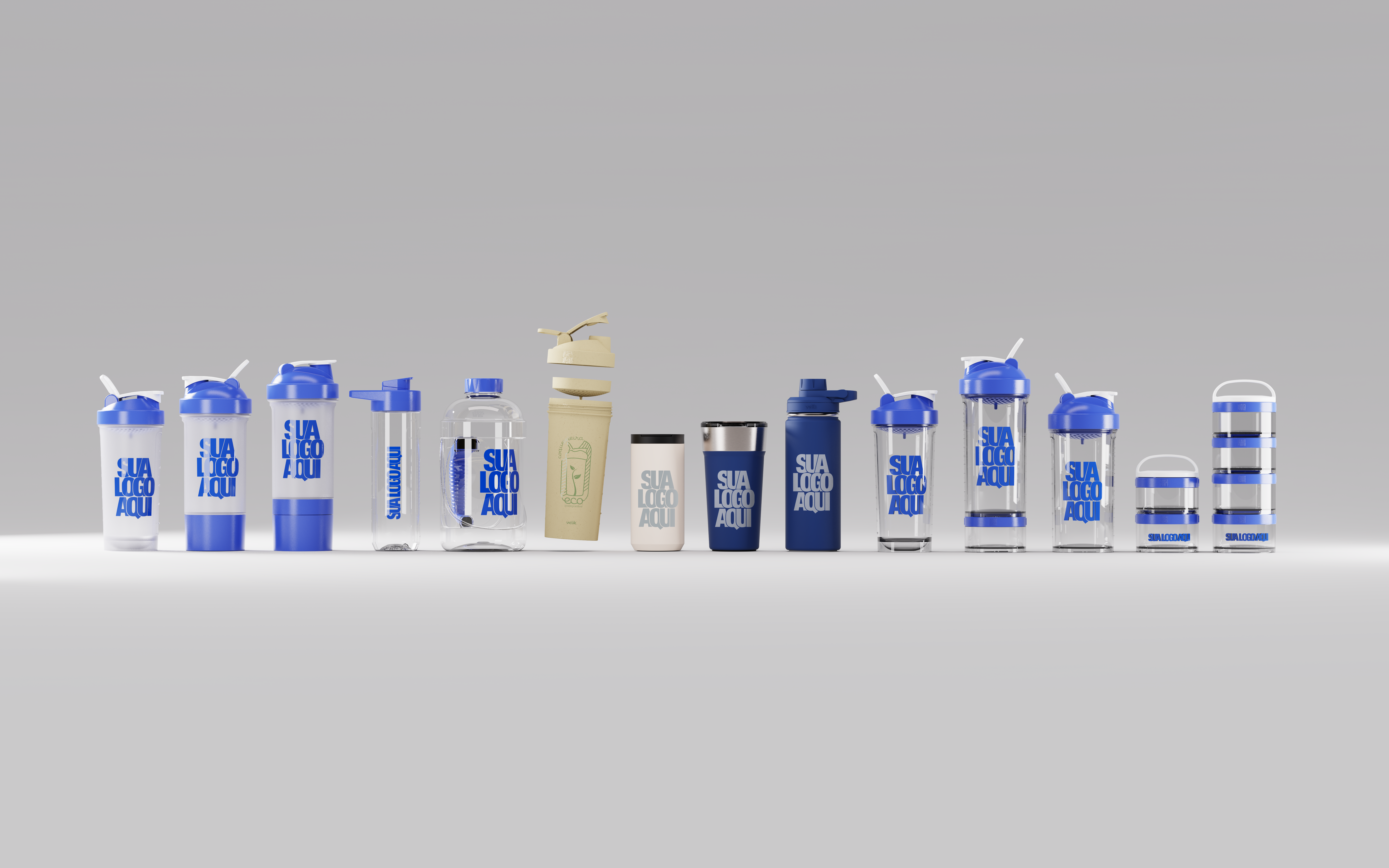 A Velik é líder absoluta nesse segmento: são mais de 1.700 opções de cores e formatos, materiais aprovados pela Anvisa e totalmente livres de BPA (algo que concorrentes nem sempre garantem). Dá para combinar as cores do seu negócio, escolher detalhes transparentes ou opacos, e criar algo que realmente expresse sua identidade visual. O mínimo de 100 unidades permite desde pequenas ações até grandes campanhas em academias, eventos ou vendas em rede.